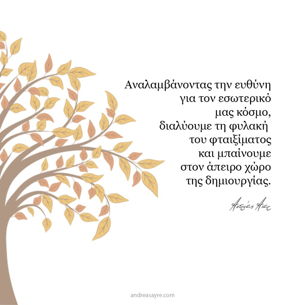 Το να αναλαμβάνουμε την ευθύνη δεν σημαίνει ότι δικαιολογούμε τις πράξεις των άλλων. Αυτό που σημαίνει είναι ότι διεκδικούμε την δυνατότητα και τη δύναμη να έχουμε τον έλεγχο των σκέψεων και των συναισθημάτων μας. Είναι να καταλάβουμε ότι ενώ ο κόσμος μπορεί να μας πετά πέτρες, εμείς είμαστε οι αρχιτέκτονες του συναισθηματικού μας τοπίου. Δεν είμαστε παθητικοί αποδέκτες του πόνου, αλλά ενεργοί συμμετέχοντες στη δημιουργία του.