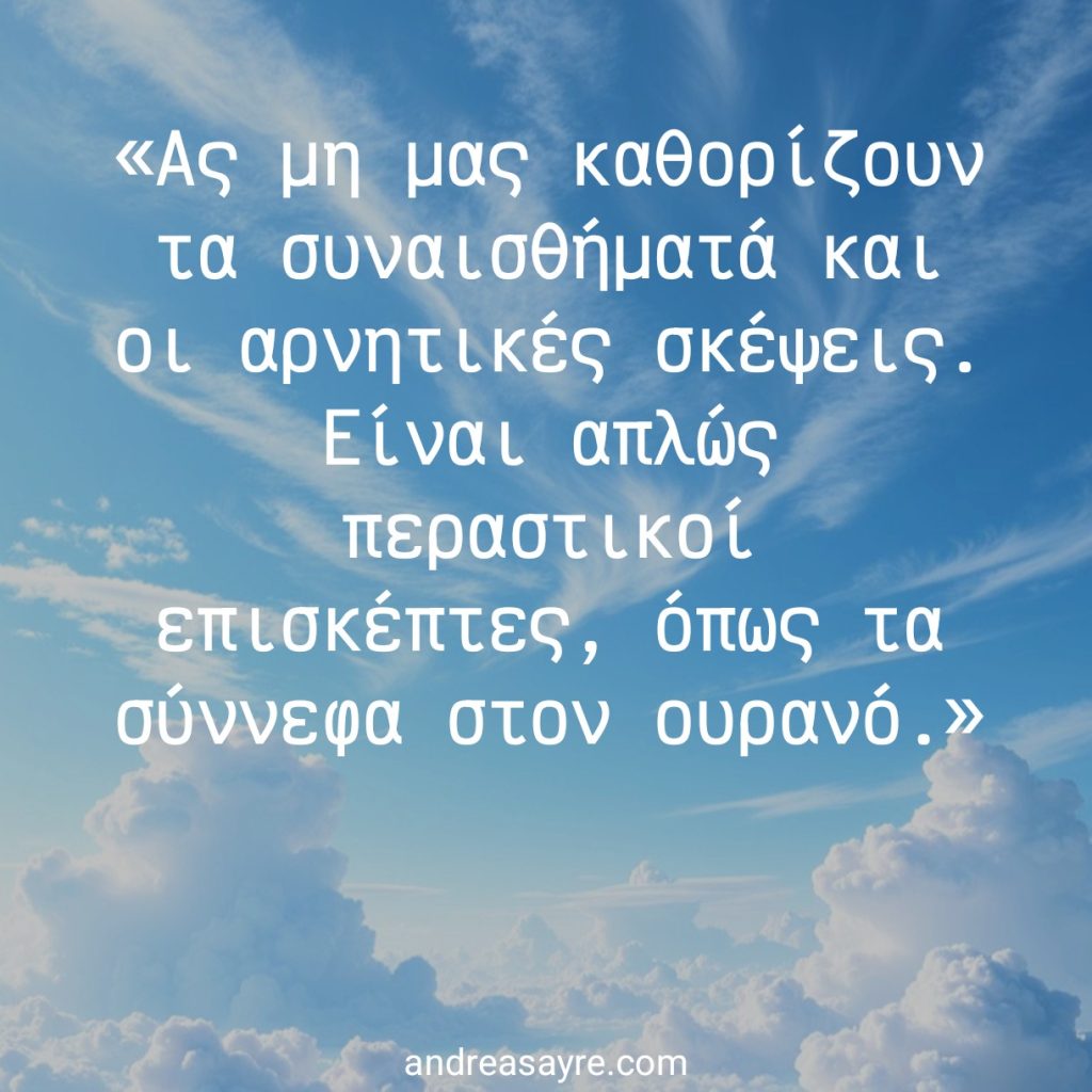 Η συνειδητοποίηση αυτή δεν μας κάνει αδιάφορους, αλλά πιο παρόντες και ήρεμους. Μας επιτρέπει να ζούμε τα συναισθήματά μας χωρίς να παγιδευόμαστε στις ιστορίες τους. Σταματάμε να ταυτιζόμαστε με την εσωτερική μας φωνή και καταλαβαίνουμε ότι οι σκέψεις είναι απλώς περαστικοί επισκέπτες. Στο τέλος, βλέπουμε καθαρά ότι αυτό που πραγματικά είμαστε δεν περιορίζεται ποτέ από τον νου.